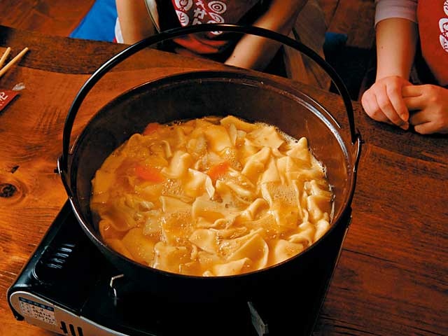 富士川町鰍沢地区十谷集落に伝わる郷土料理。小麦粉を練って、農具の「箕(み)」の形にして作ったほうとうに似た料理。鍋にゴボウ、大根、里芋、カボチャなどを入れて煮込まれる。